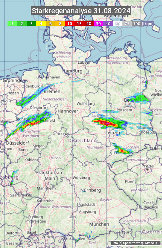 Die Starkregenanalyse zeigt die 24h-Niederschlagssumme am 31.08.2024. Sie basiert auf Radardaten vom Deutschen Wetterdienst in Kombination mit Wetterstationsbeobachtungen.