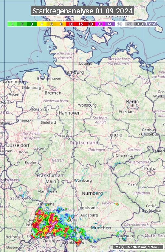 Die Starkregenanalyse zeigt die 24h-Niederschlagssumme am 01.09.2024. Sie basiert auf Radardaten vom Deutschen Wetterdienst in Kombination mit Wetterstationsbeobachtungen.
