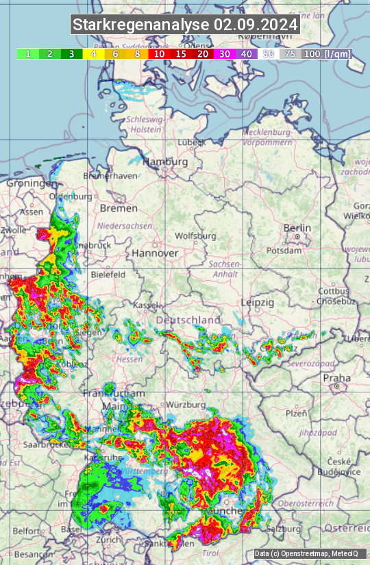 Die Starkregenanalyse zeigt die 24h-Niederschlagssumme am 02.09.2024. Sie basiert auf Radardaten vom Deutschen Wetterdienst in Kombination mit Wetterstationsbeobachtungen.