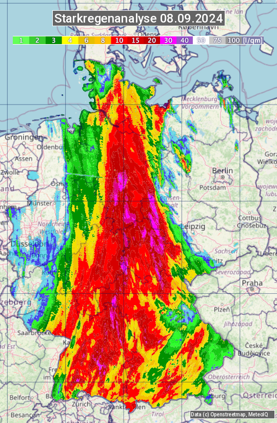 Die Starkregenanalyse zeigt die 24h-Niederschlagssumme am 08.09.2024. Sie basiert auf Radardaten vom Deutschen Wetterdienst in Kombination mit Wetterstationsbeobachtungen.