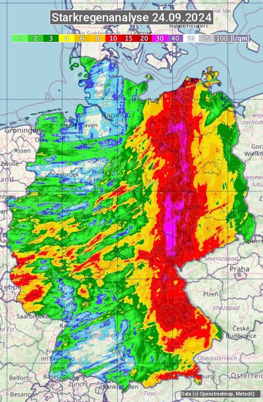 Die Starkregenanalyse zeigt die 24h-Niederschlagssumme am 24.09.2024. Sie basiert auf Radardaten vom Deutschen Wetterdienst in Kombination mit Wetterstationsbeobachtungen.