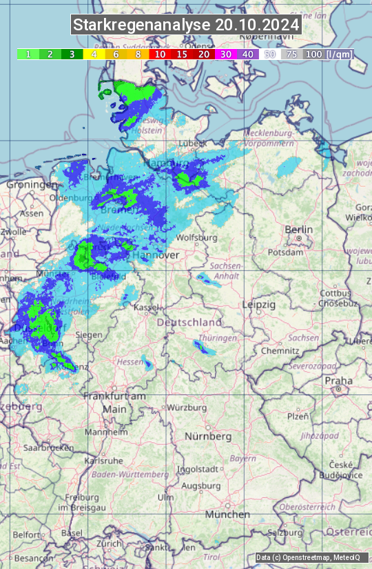 Die Starkregenanalyse zeigt die 24h-Niederschlagssumme am 20.10.2024. Sie basiert auf Radardaten vom Deutschen Wetterdienst in Kombination mit Wetterstationsbeobachtungen.