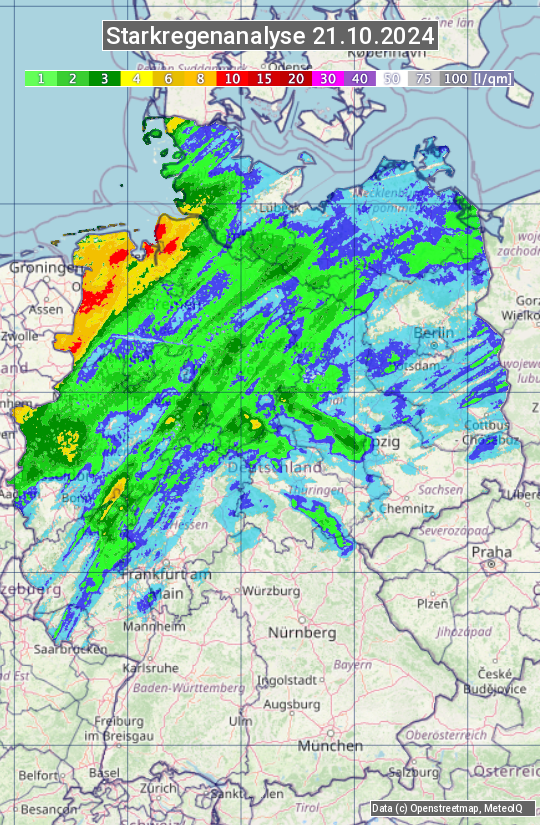 Die Starkregenanalyse zeigt die 24h-Niederschlagssumme am 21.10.2024. Sie basiert auf Radardaten vom Deutschen Wetterdienst in Kombination mit Wetterstationsbeobachtungen.