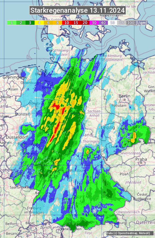Die Starkregenanalyse zeigt die 24h-Niederschlagssumme am 13.11.2024. Sie basiert auf Radardaten vom Deutschen Wetterdienst in Kombination mit Wetterstationsbeobachtungen.