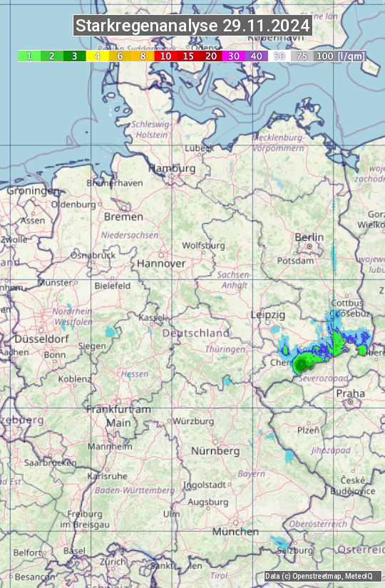 Die Starkregenanalyse zeigt die 24h-Niederschlagssumme am 29.11.2024. Sie basiert auf Radardaten vom Deutschen Wetterdienst in Kombination mit Wetterstationsbeobachtungen.