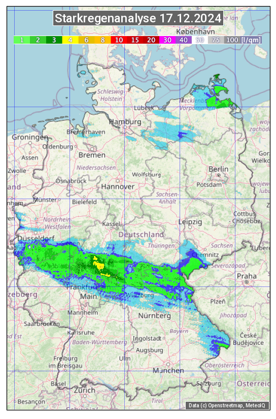 Die Starkregenanalyse zeigt die 24h-Niederschlagssumme am 17.12.2024. Sie basiert auf Radardaten vom Deutschen Wetterdienst in Kombination mit Wetterstationsbeobachtungen.