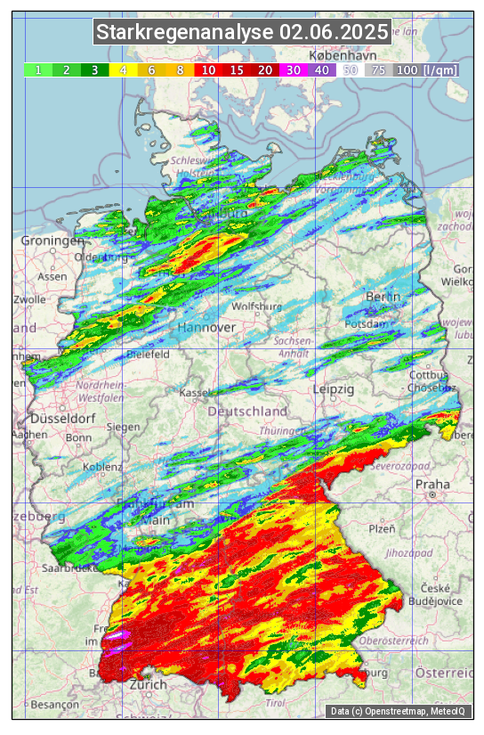 Die Starkregenanalyse zeigt die 24h-Niederschlagssumme am 02.06.2025. Sie basiert auf Radardaten vom Deutschen Wetterdienst in Kombination mit Wetterstationsbeobachtungen.