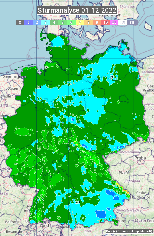Die Sturmanalyse vom 01.12.2022 zeigt die maximalen Windböen des Tages. Die Angabe erfolgt als Windstärke in Beaufort.