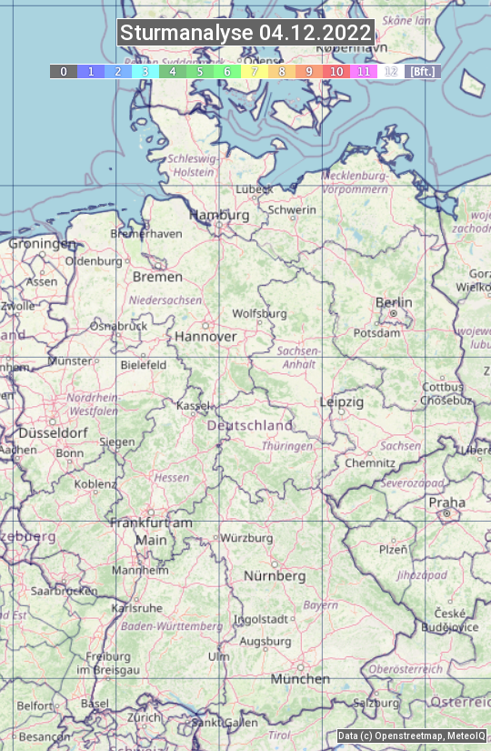Die Sturmanalyse vom 04.12.2022 zeigt die maximalen Windböen des Tages. Die Angabe erfolgt als Windstärke in Beaufort.