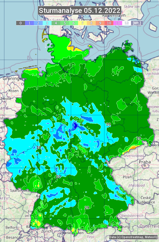 Die Sturmanalyse vom 05.12.2022 zeigt die maximalen Windböen des Tages. Die Angabe erfolgt als Windstärke in Beaufort.