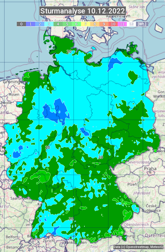 Die Sturmanalyse vom 10.12.2022 zeigt die maximalen Windböen des Tages. Die Angabe erfolgt als Windstärke in Beaufort.