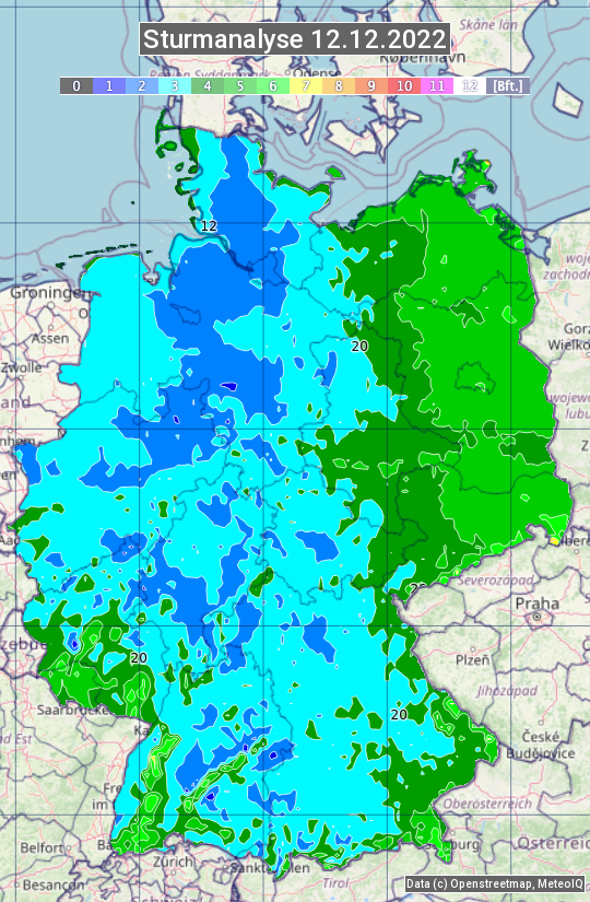 Die Sturmanalyse vom 12.12.2022 zeigt die maximalen Windböen des Tages. Die Angabe erfolgt als Windstärke in Beaufort.
