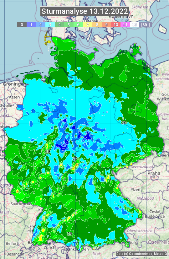 Die Sturmanalyse vom 13.12.2022 zeigt die maximalen Windböen des Tages. Die Angabe erfolgt als Windstärke in Beaufort.