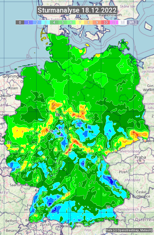 Die Sturmanalyse vom 18.12.2022 zeigt die maximalen Windböen des Tages. Die Angabe erfolgt als Windstärke in Beaufort.