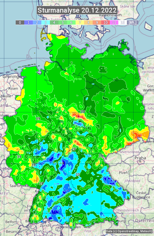 Die Sturmanalyse vom 20.12.2022 zeigt die maximalen Windböen des Tages. Die Angabe erfolgt als Windstärke in Beaufort.
