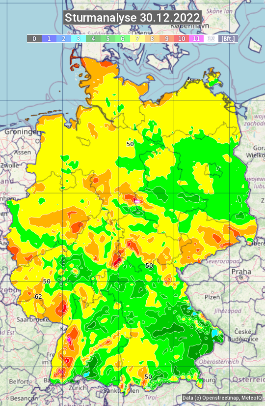 Die Sturmanalyse vom 30.12.2022 zeigt die maximalen Windböen des Tages. Die Angabe erfolgt als Windstärke in Beaufort.