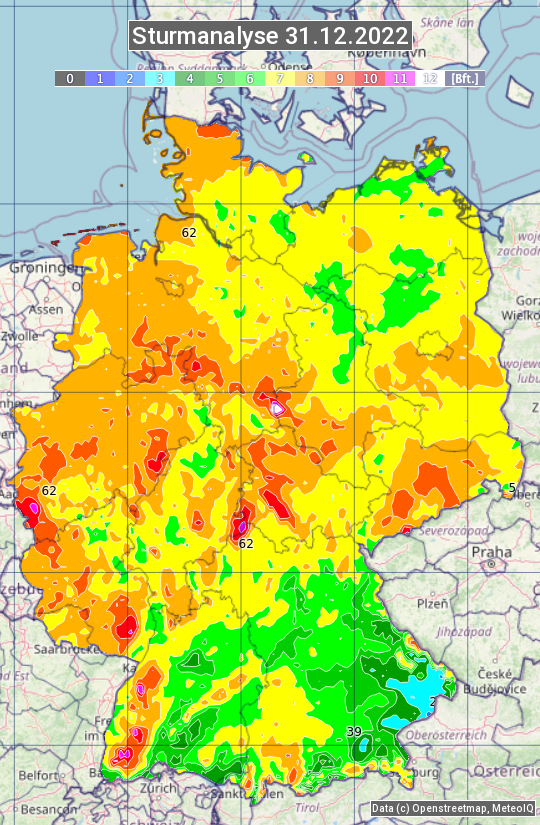 Die Sturmanalyse vom 31.12.2022 zeigt die maximalen Windböen des Tages. Die Angabe erfolgt als Windstärke in Beaufort.