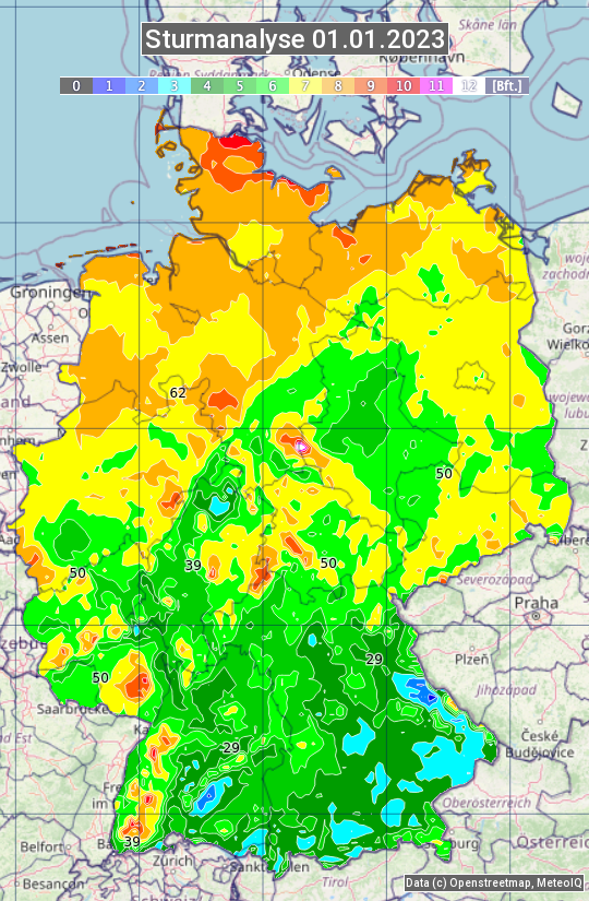 Die Sturmanalyse vom 01.01.2023 zeigt die maximalen Windböen des Tages. Die Angabe erfolgt als Windstärke in Beaufort.