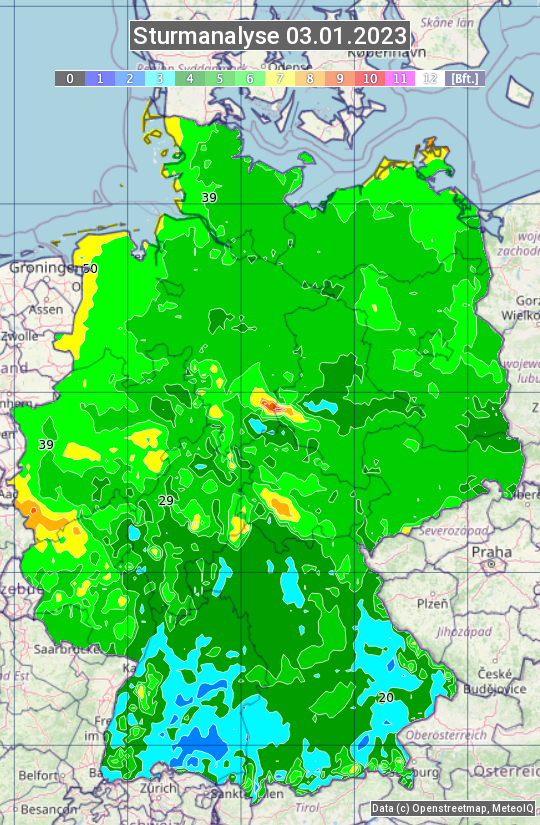 Die Sturmanalyse vom 03.01.2023 zeigt die maximalen Windböen des Tages. Die Angabe erfolgt als Windstärke in Beaufort.