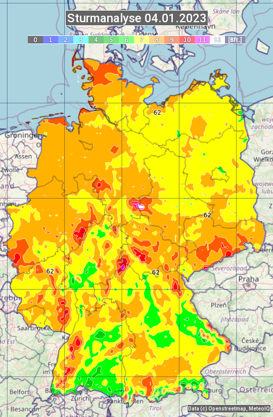 Die Sturmanalyse vom 04.01.2023 zeigt die maximalen Windböen des Tages. Die Angabe erfolgt als Windstärke in Beaufort.