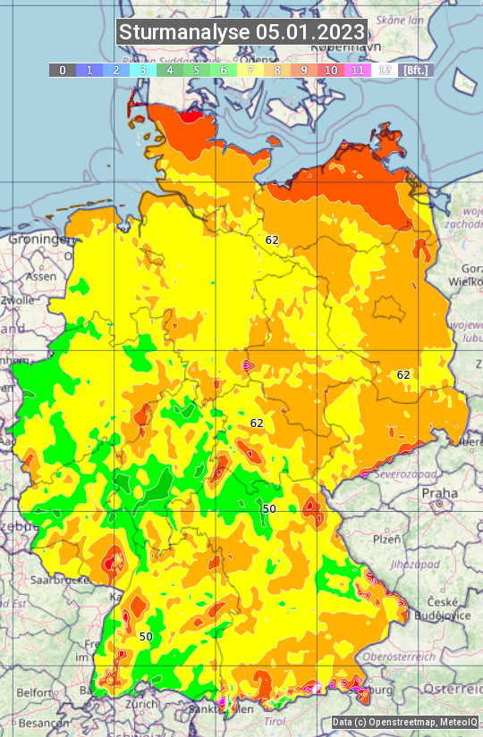 Die Sturmanalyse vom 05.01.2023 zeigt die maximalen Windböen des Tages. Die Angabe erfolgt als Windstärke in Beaufort.
