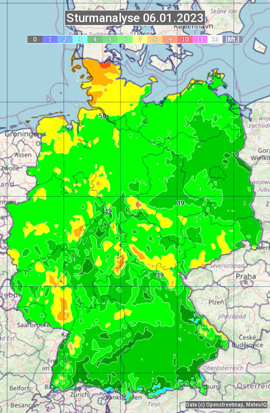 Die Sturmanalyse vom 06.01.2023 zeigt die maximalen Windböen des Tages. Die Angabe erfolgt als Windstärke in Beaufort.