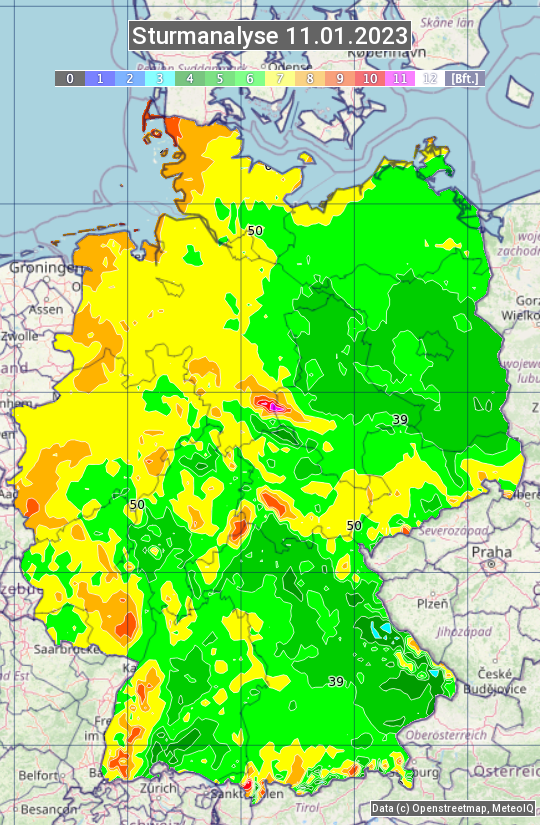 Die Sturmanalyse vom 11.01.2023 zeigt die maximalen Windböen des Tages. Die Angabe erfolgt als Windstärke in Beaufort.