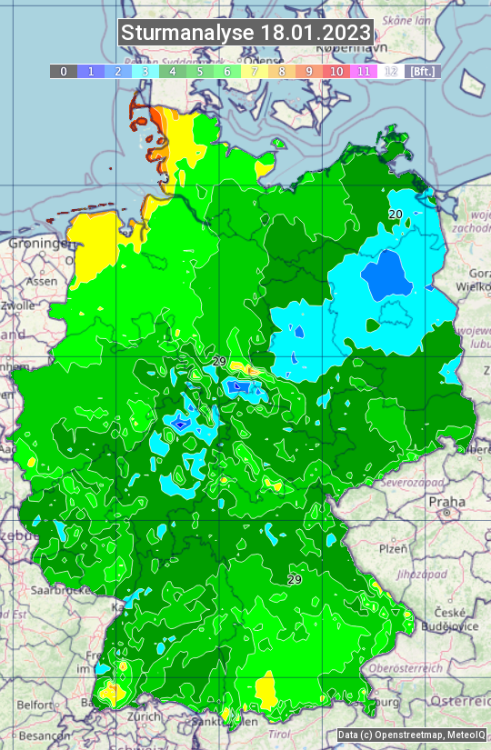 Die Sturmanalyse vom 18.01.2023 zeigt die maximalen Windböen des Tages. Die Angabe erfolgt als Windstärke in Beaufort.