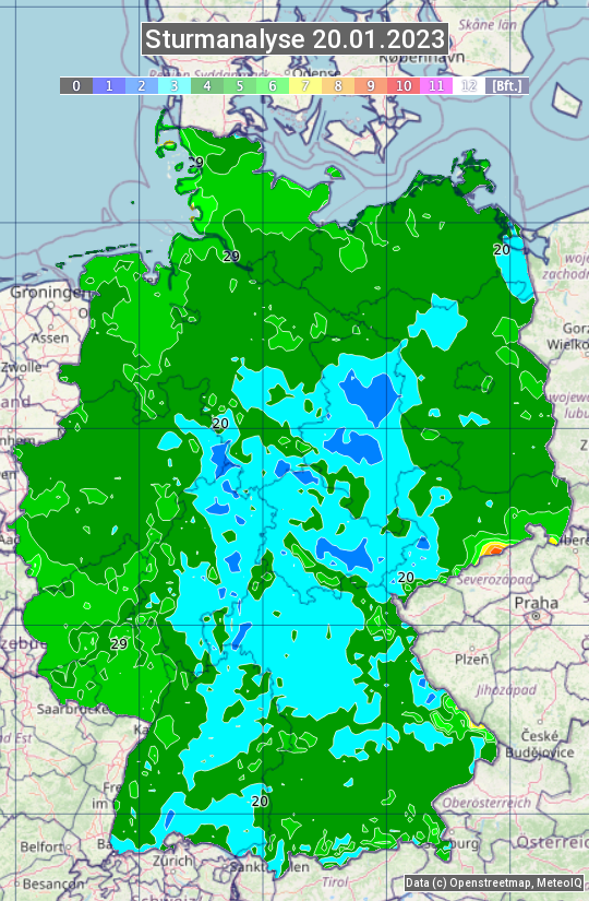 Die Sturmanalyse vom 20.01.2023 zeigt die maximalen Windböen des Tages. Die Angabe erfolgt als Windstärke in Beaufort.
