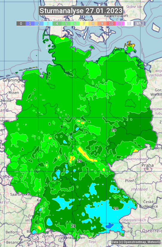 Die Sturmanalyse vom 27.01.2023 zeigt die maximalen Windböen des Tages. Die Angabe erfolgt als Windstärke in Beaufort.