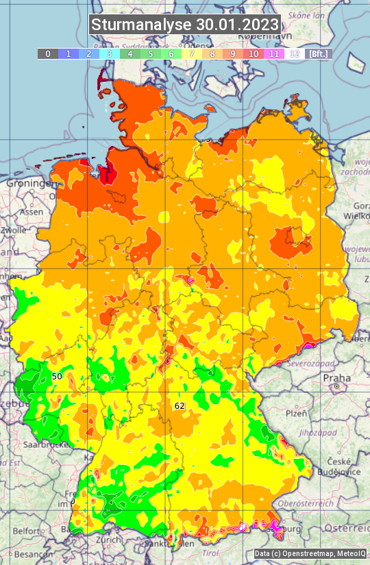 Die Sturmanalyse vom 30.01.2023 zeigt die maximalen Windböen des Tages. Die Angabe erfolgt als Windstärke in Beaufort.