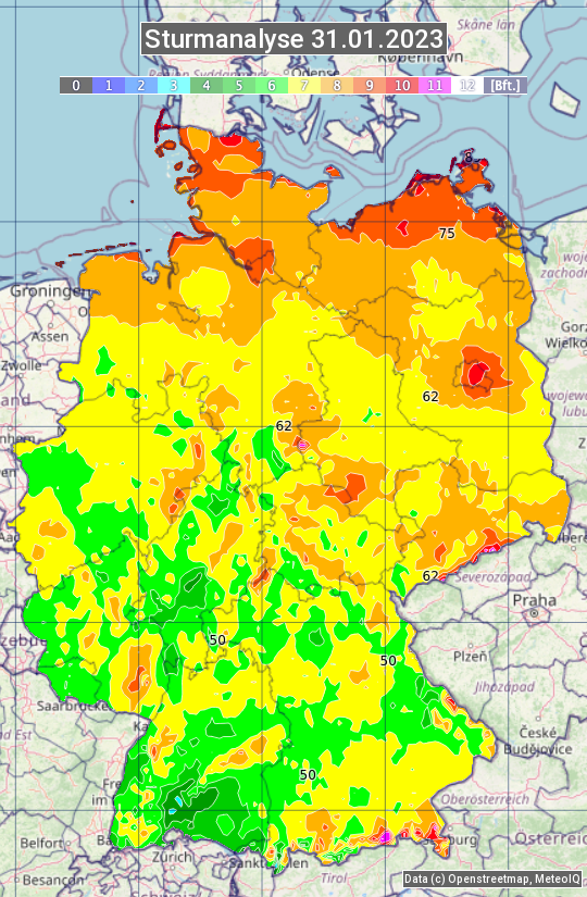 Die Sturmanalyse vom 31.01.2023 zeigt die maximalen Windböen des Tages. Die Angabe erfolgt als Windstärke in Beaufort.