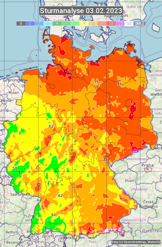 Die Sturmanalyse vom 03.02.2023 zeigt die maximalen Windböen des Tages. Die Angabe erfolgt als Windstärke in Beaufort.