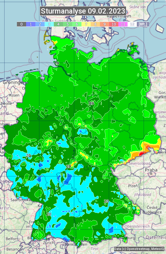 Die Sturmanalyse vom 09.02.2023 zeigt die maximalen Windböen des Tages. Die Angabe erfolgt als Windstärke in Beaufort.