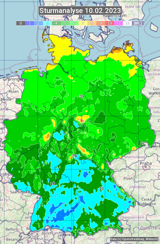 Die Sturmanalyse vom 10.02.2023 zeigt die maximalen Windböen des Tages. Die Angabe erfolgt als Windstärke in Beaufort.