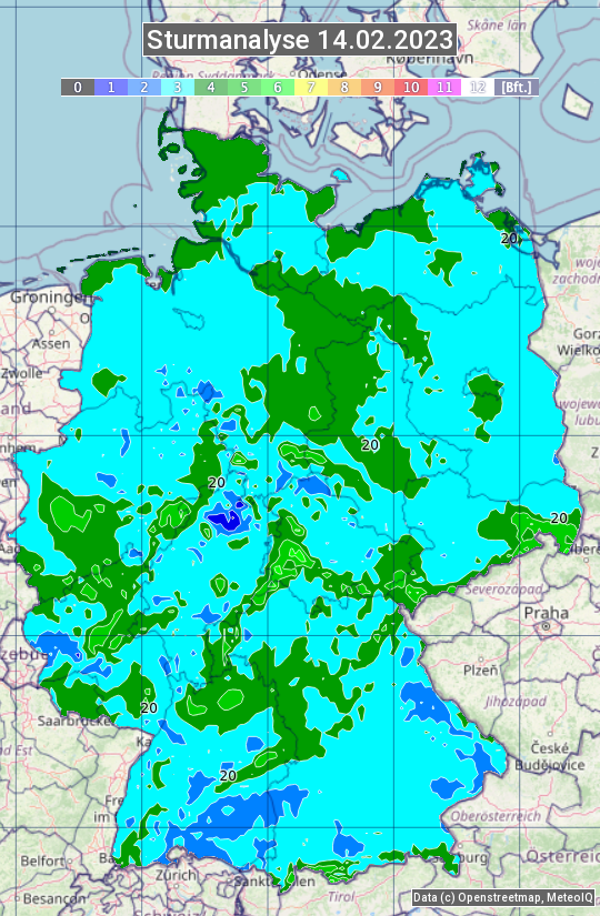 Die Sturmanalyse vom 14.02.2023 zeigt die maximalen Windböen des Tages. Die Angabe erfolgt als Windstärke in Beaufort.