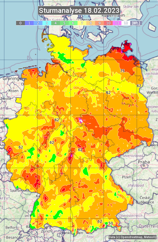 Die Sturmanalyse vom 18.02.2023 zeigt die maximalen Windböen des Tages. Die Angabe erfolgt als Windstärke in Beaufort.
