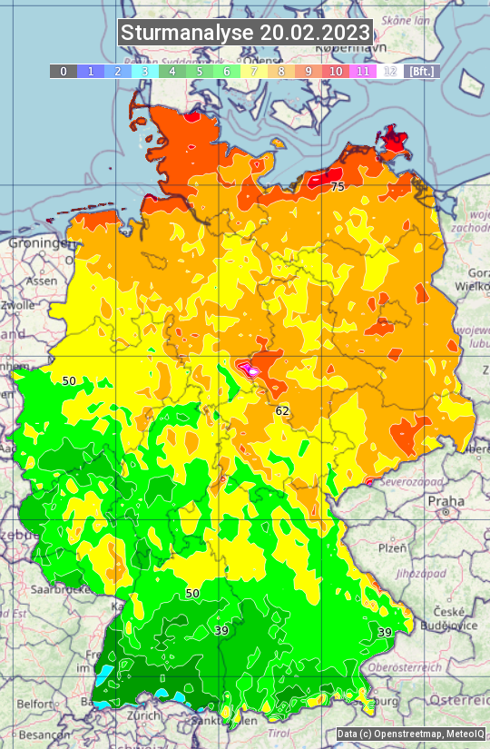 Die Sturmanalyse vom 20.02.2023 zeigt die maximalen Windböen des Tages. Die Angabe erfolgt als Windstärke in Beaufort.