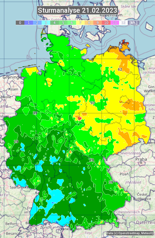 Die Sturmanalyse vom 21.02.2023 zeigt die maximalen Windböen des Tages. Die Angabe erfolgt als Windstärke in Beaufort.