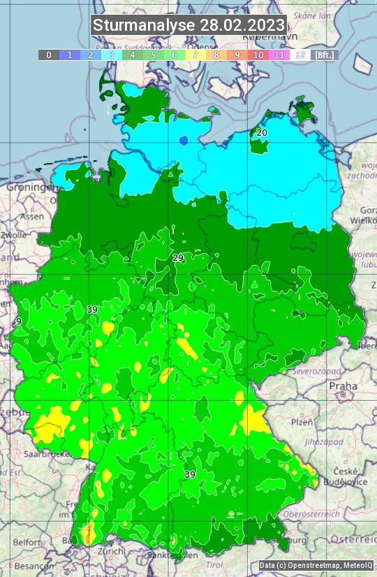 Die Sturmanalyse vom 28.02.2023 zeigt die maximalen Windböen des Tages. Die Angabe erfolgt als Windstärke in Beaufort.