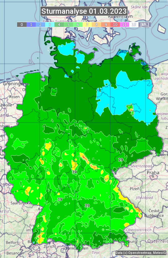 Die Sturmanalyse vom 01.03.2023 zeigt die maximalen Windböen des Tages. Die Angabe erfolgt als Windstärke in Beaufort.