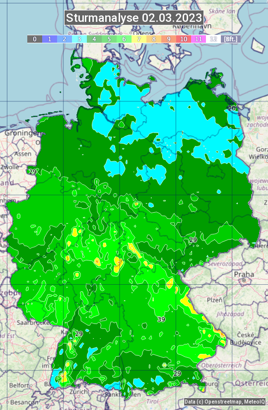 Die Sturmanalyse vom 02.03.2023 zeigt die maximalen Windböen des Tages. Die Angabe erfolgt als Windstärke in Beaufort.