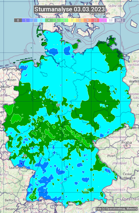Die Sturmanalyse vom 03.03.2023 zeigt die maximalen Windböen des Tages. Die Angabe erfolgt als Windstärke in Beaufort.