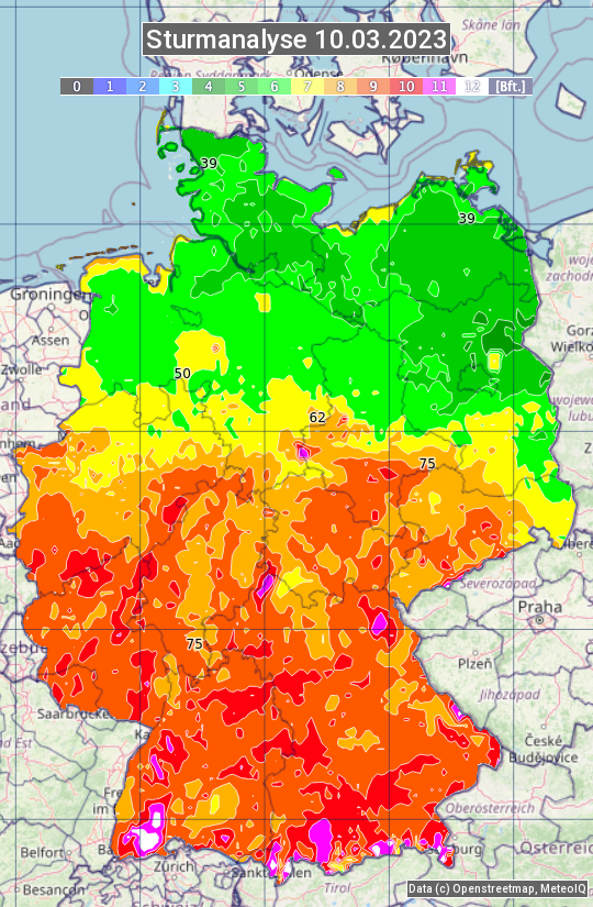 Die Sturmanalyse vom 10.03.2023 zeigt die maximalen Windböen des Tages. Die Angabe erfolgt als Windstärke in Beaufort.