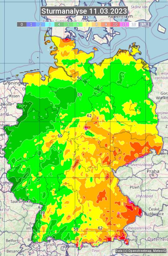 Die Sturmanalyse vom 11.03.2023 zeigt die maximalen Windböen des Tages. Die Angabe erfolgt als Windstärke in Beaufort.