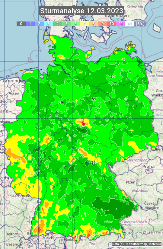 Die Sturmanalyse vom 12.03.2023 zeigt die maximalen Windböen des Tages. Die Angabe erfolgt als Windstärke in Beaufort.
