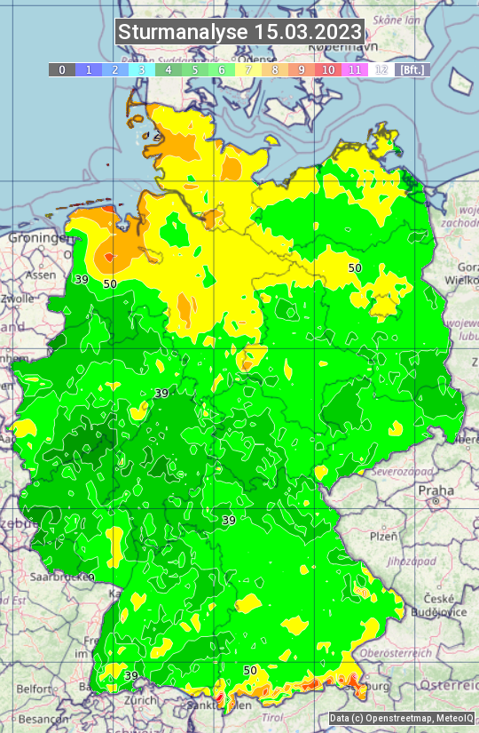 Die Sturmanalyse vom 15.03.2023 zeigt die maximalen Windböen des Tages. Die Angabe erfolgt als Windstärke in Beaufort.