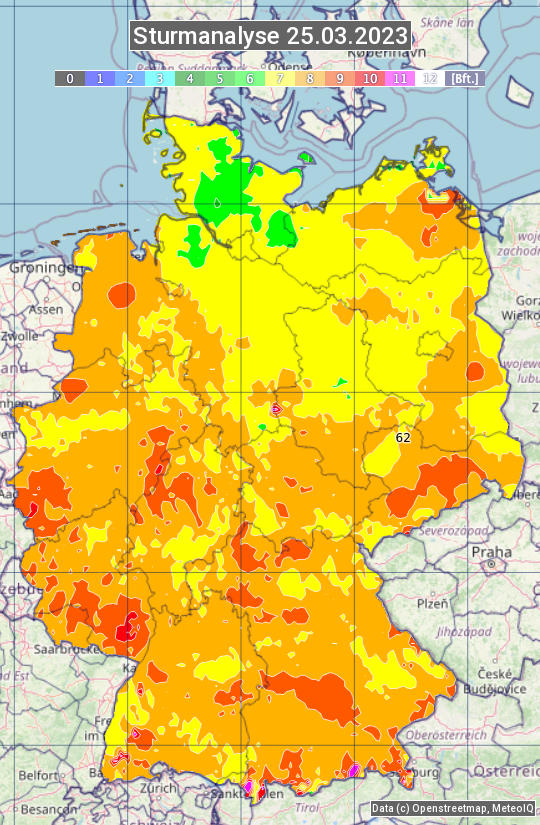 Die Sturmanalyse vom 25.03.2023 zeigt die maximalen Windböen des Tages. Die Angabe erfolgt als Windstärke in Beaufort.