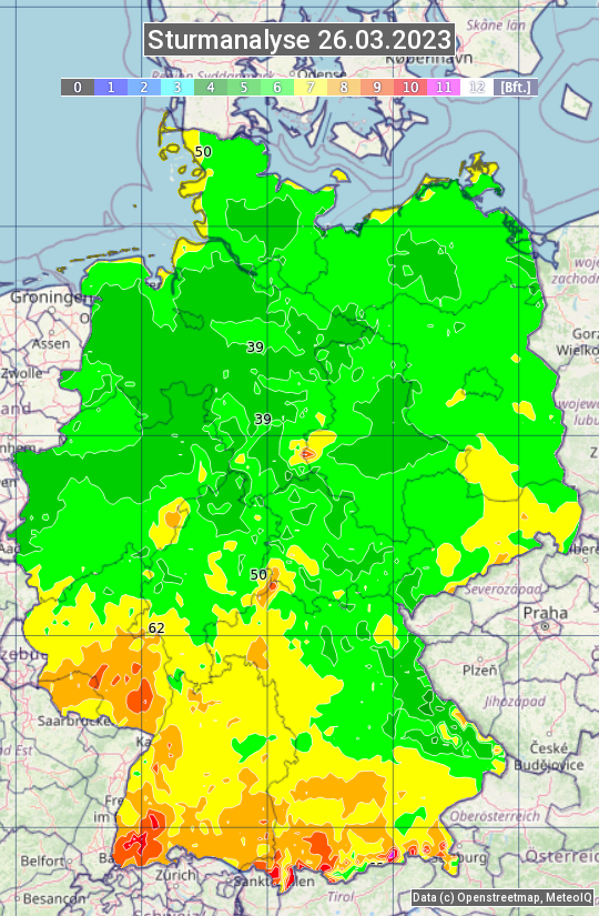 Die Sturmanalyse vom 26.03.2023 zeigt die maximalen Windböen des Tages. Die Angabe erfolgt als Windstärke in Beaufort.