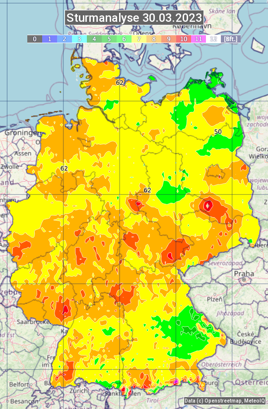 Die Sturmanalyse vom 30.03.2023 zeigt die maximalen Windböen des Tages. Die Angabe erfolgt als Windstärke in Beaufort.